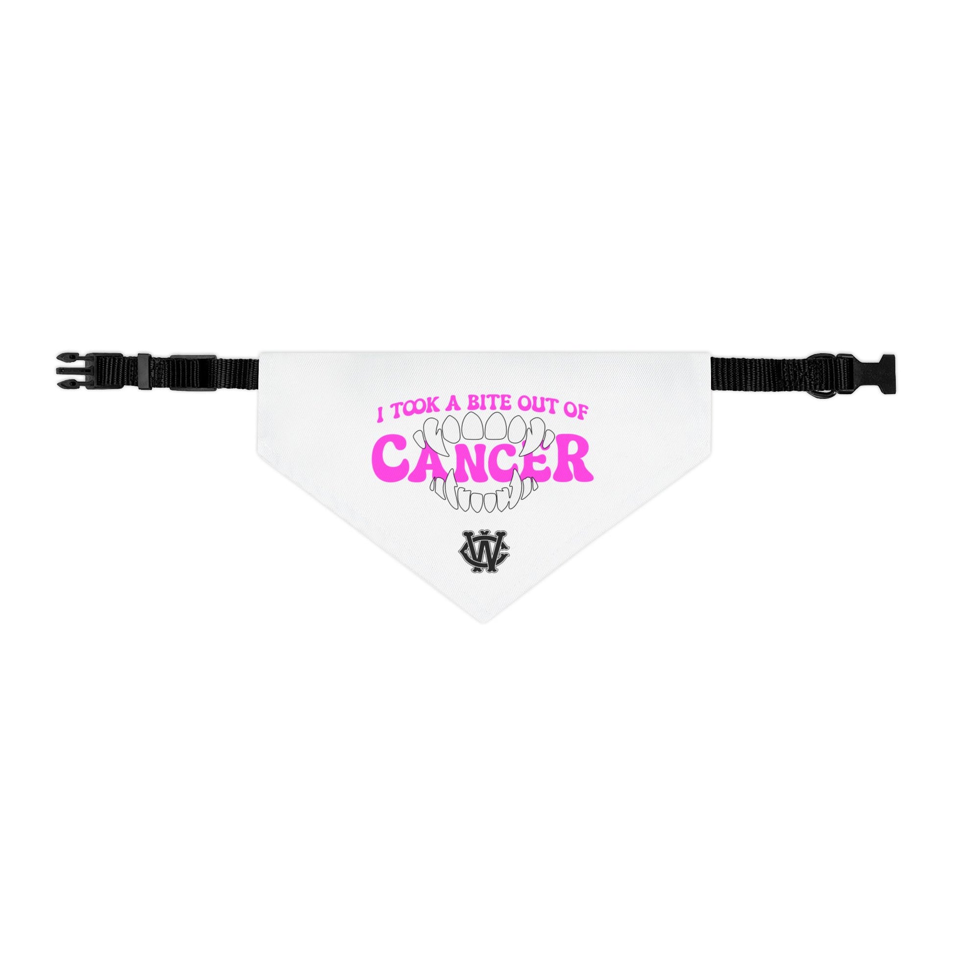 This pet bandana collar carries bold, playful energy with a touch of defiance. Soft, quick-drying polyester holds a bright, all-over print that reads like a tiny victory lap: a graphic of teeth and the phrase “I took a bite out of CANCER” in vivid pink. The triangular bandana attaches to an adjustable black collar with a secure plastic buckle, so it sits neatly around your pet’s neck without fuss. It’s the kind of accessory that sparks smiles during walks, brings a little confidence to recovery photos, and becomes a small emblem of strength when heading to awareness events or casual gatherings with fellow supporters.